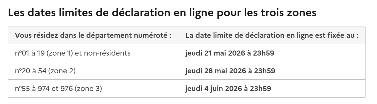 Le service de déclaration en ligne ouvre cette année le jeudi 9 avril 2026 et jusqu’aux dates limites établies par zone (selon les départements).