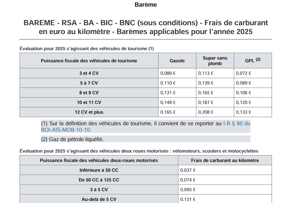 L'associé d'une EURL qui n'a pas opté pour l'impôt sur les sociétés et qui réalise des BIC n'est pas autorisé à utiliser le barème des prix de revient kilométrique de l'Administration pour estimer ses frais de voiture personnelle (contrairement à celui qui réalise des BNC). Il ne peut en effet déduire que ses seuls frais réels et justifiés. En revanche, il est autorisé à déduire de son résultat fiscal (c'est-à-dire de son revenu imposable et donc de la base de de calcul de ses cotisations) ses frais de carburant exposés pour se rendre de son domicile à son lieu de travail au moyen de son véhicule personnel (voiture ou moto), et il peut à cet effet utiliser des barèmes spécifiques dits « barèmes des frais de carburant » (sous réserve bien sûr que ces frais n'aient pas déjà été pris en charge par sa société). S'agissant de vos frais supportés en 2025, les nouveaux barèmes sont désormais connus. Ils sont tous en baisse, que ça soit pour les véhicules à moteur essence, diesel et GPL, ainsi que pour les véhicules deux-roues. Voici ces nouveaux barèmes : ATTENTION : L'associé d'une EURL qui a opté pour l'impôt sur les sociétés n'est pas autorisé quant à lui à déduire ces mêmes frais. Ils sont en effet réputés être déjà couverts par la déduction de 10 % dont il bénéficie sur son revenu imposable. Source : BOI-BIC-DECLA-30-20-20-§290, actualisation du 18 février 2026 Si vous avez utilisé votre véhicule personnel (auto ou moto) pour vous rendre de votre domicile à votre lieu de travail, vous pouvez déduire de votre résultat 2025 les frais de carburant correspondants. Le barème permettant de les évaluer vient d'être publié.